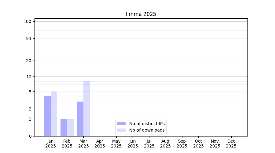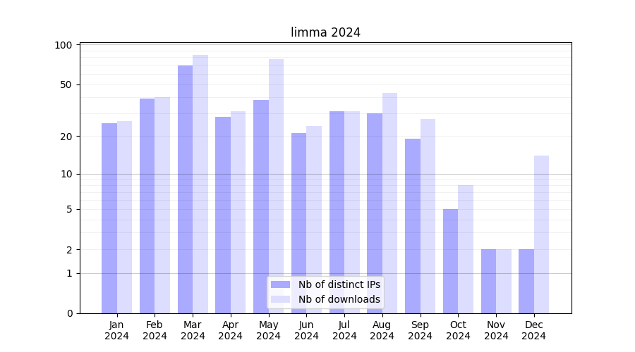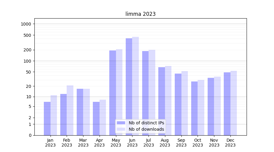 Number of downloads for annotation package limma, year by year, from 2025 back to 2014 (years with no downloads are omitted):