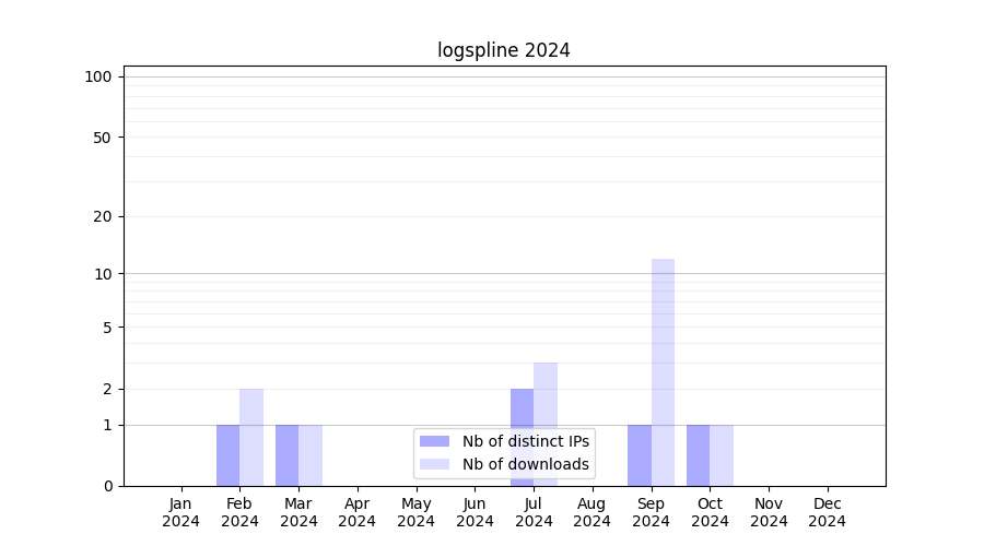 Number of downloads for annotation package logspline, year by year, from 2025 back to 2014 (years with no downloads are omitted):