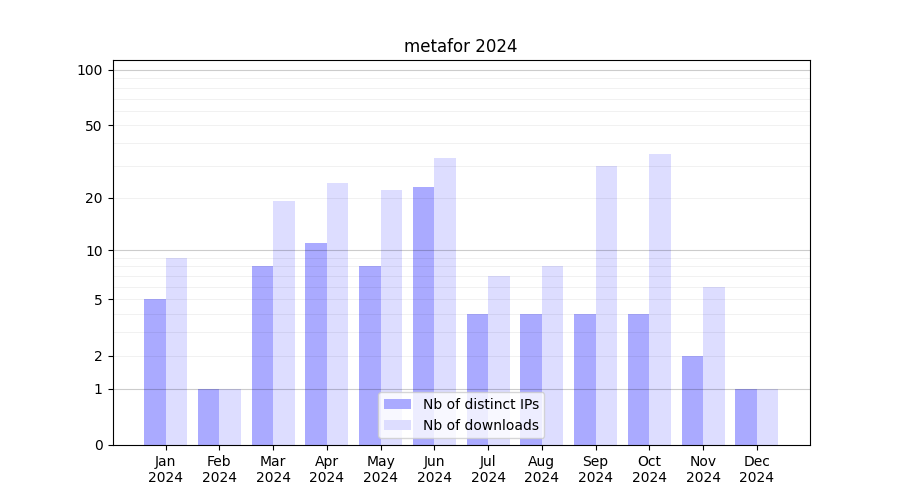 Number of downloads for annotation package metafor, year by year, from 2025 back to 2014 (years with no downloads are omitted):