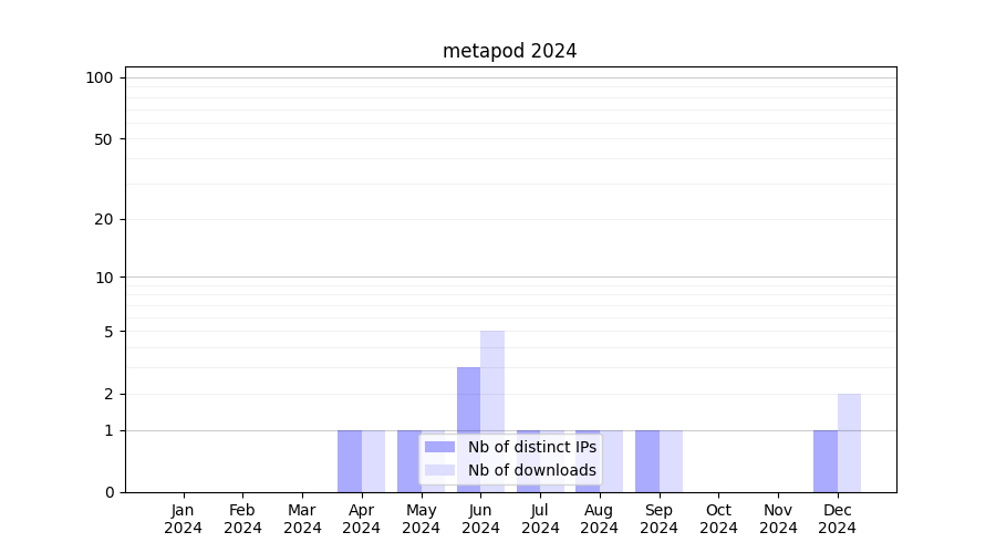 Number of downloads for annotation package metapod, year by year, from 2025 back to 2014 (years with no downloads are omitted):