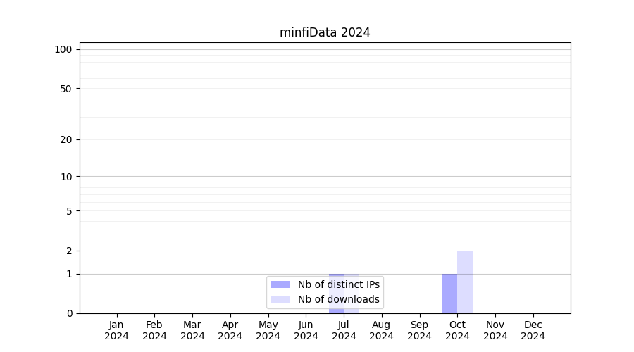 Number of downloads for annotation package minfiData, year by year, from 2025 back to 2014 (years with no downloads are omitted):