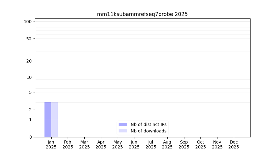 Number of downloads for annotation package mm11ksubammrefseq7probe, year by year, from 2025 back to 2014 (years with no downloads are omitted):