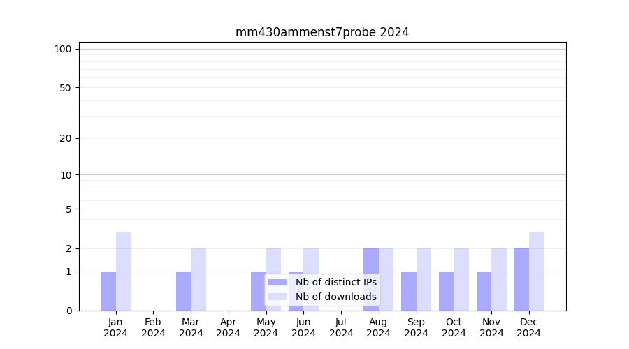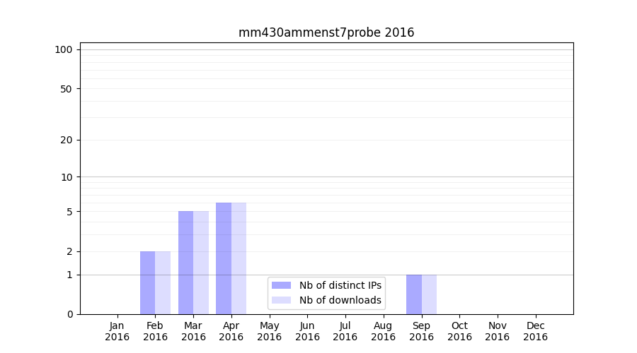 Number of downloads for annotation package mm430ammenst7probe, year by year, from 2025 back to 2014 (years with no downloads are omitted):