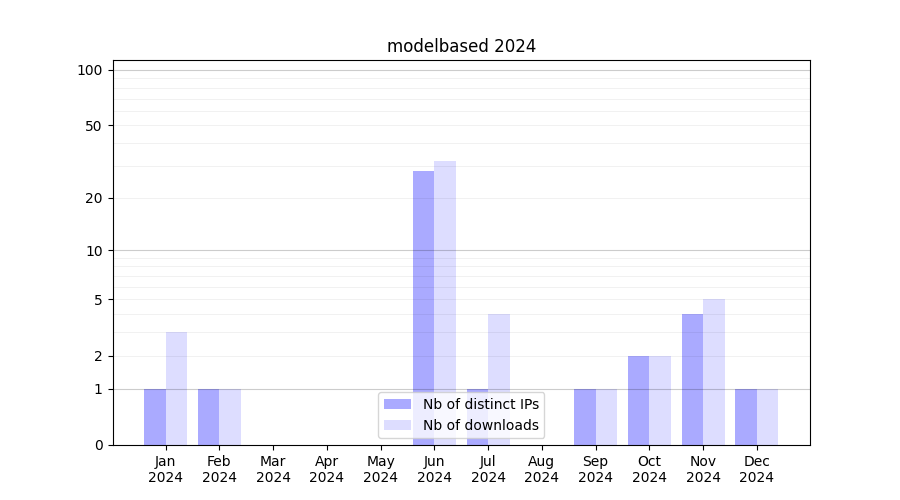 Number of downloads for annotation package modelbased, year by year, from 2025 back to 2014 (years with no downloads are omitted):