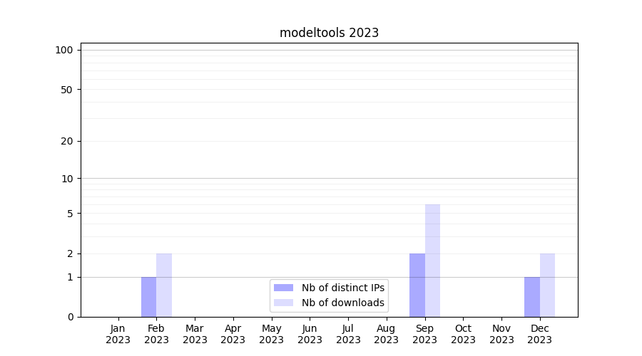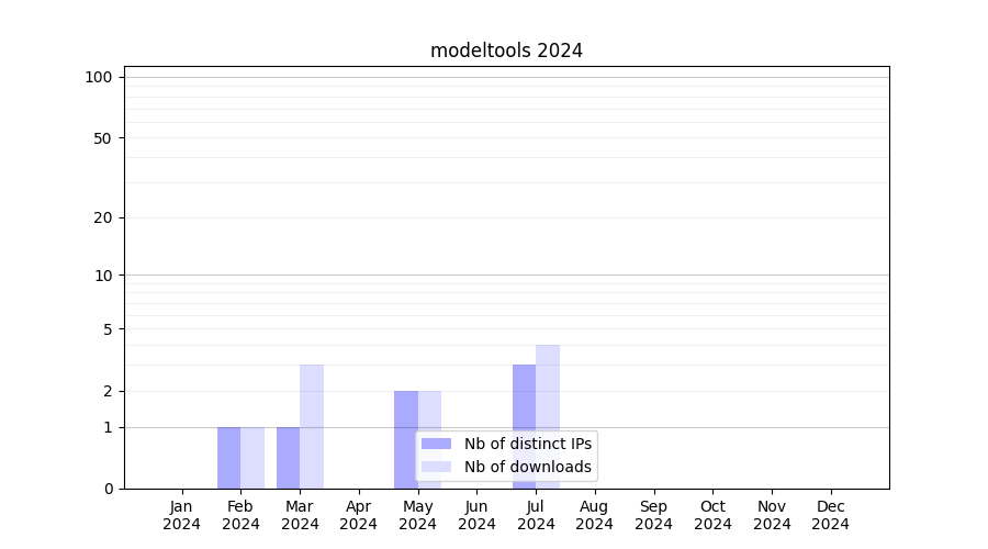 Number of downloads for annotation package modeltools, year by year, from 2025 back to 2014 (years with no downloads are omitted):