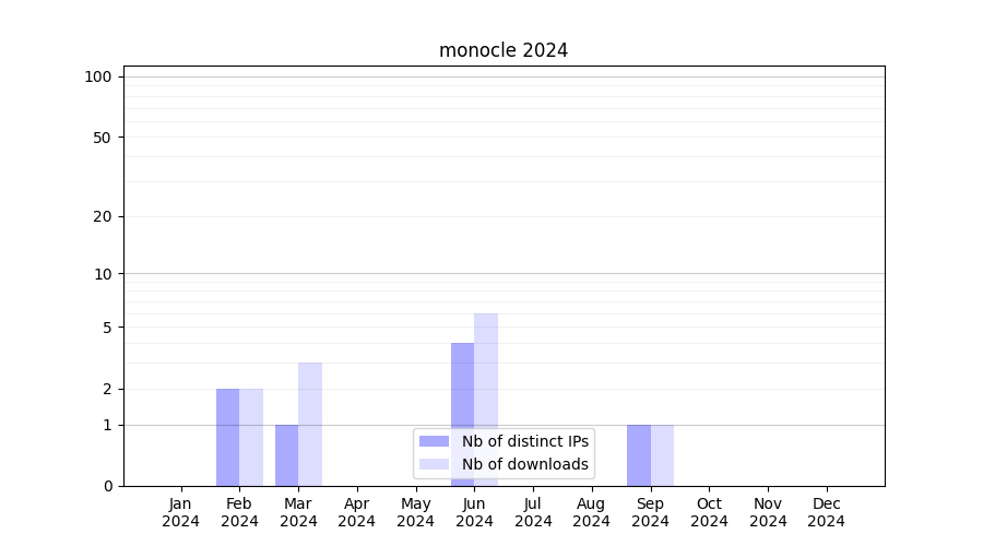 Number of downloads for annotation package monocle, year by year, from 2025 back to 2014 (years with no downloads are omitted):