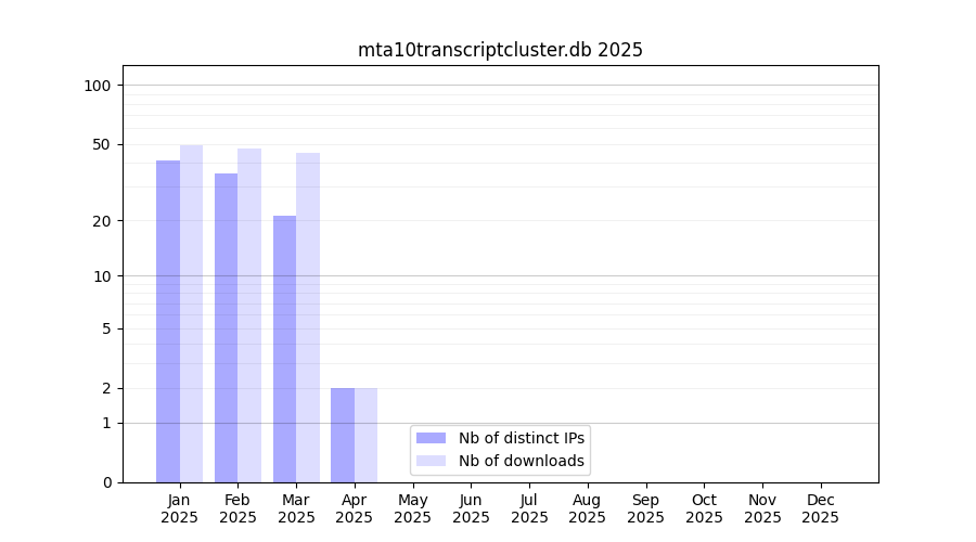 Number of downloads for annotation package mta10transcriptcluster.db, year by year, from 2025 back to 2014 (years with no downloads are omitted):