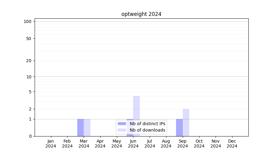 Number of downloads for annotation package optweight, year by year, from 2025 back to 2014 (years with no downloads are omitted):