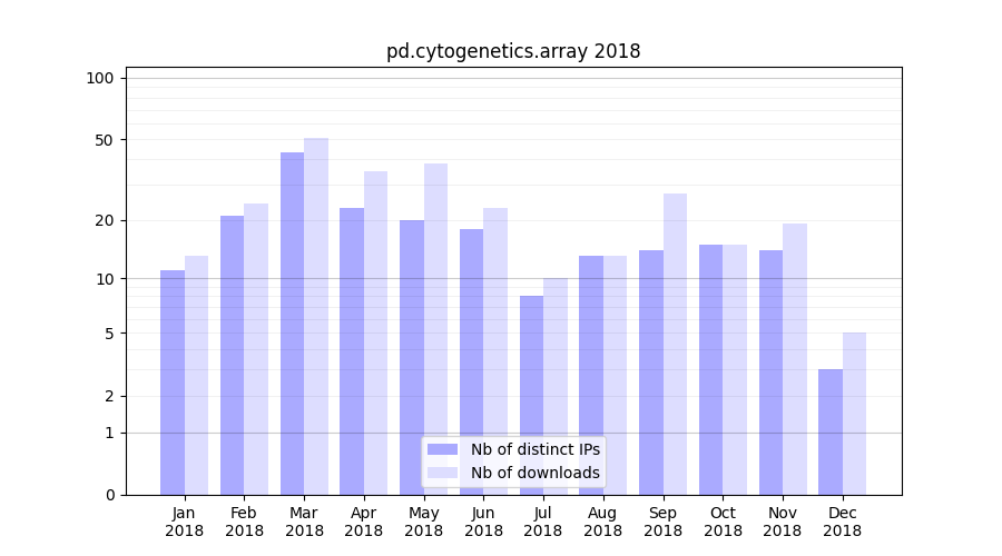 Number of downloads for annotation package pd.cytogenetics.array, year by year, from 2025 back to 2014 (years with no downloads are omitted):
