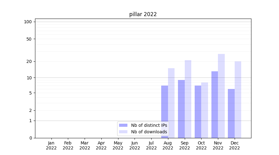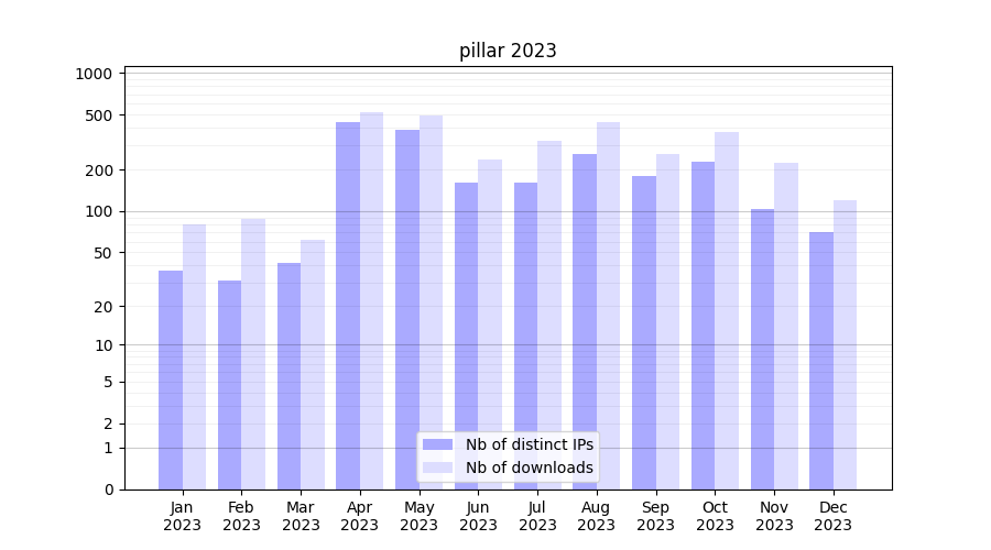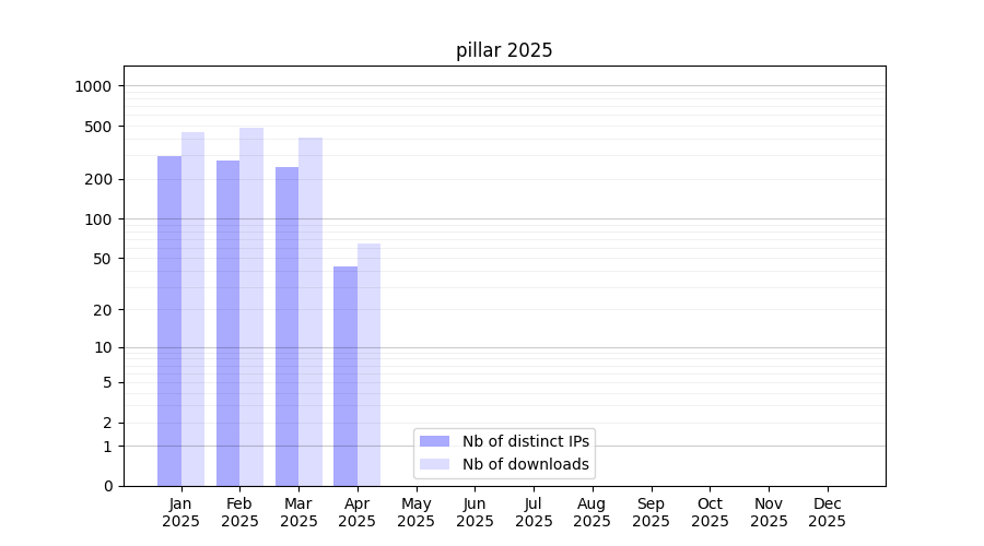 Number of downloads for annotation package pillar, year by year, from 2025 back to 2014 (years with no downloads are omitted):