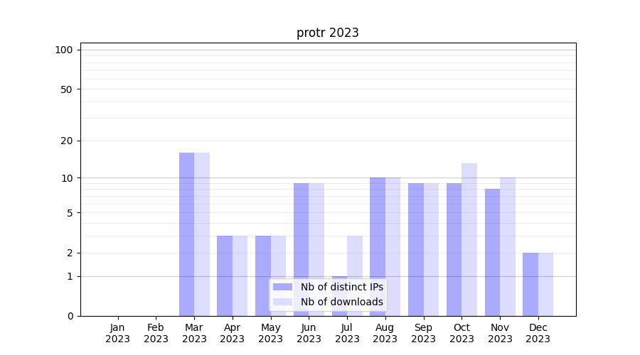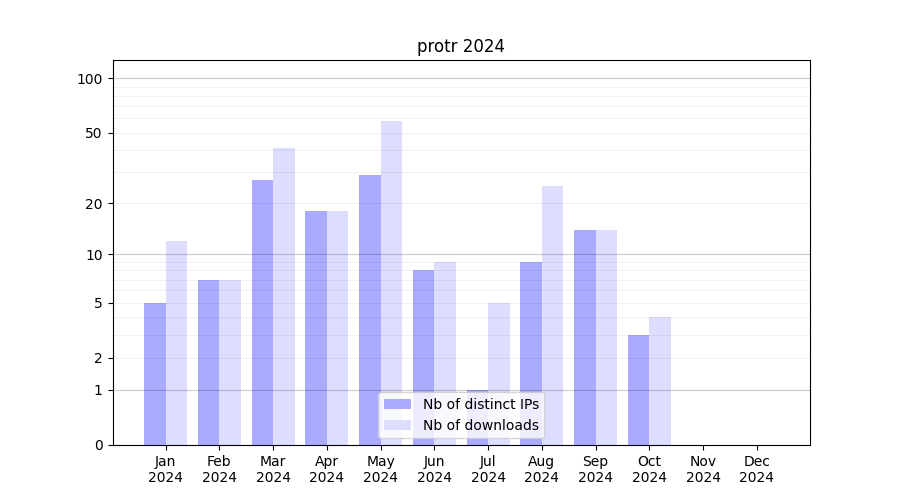 Number of downloads for annotation package protr, year by year, from 2025 back to 2014 (years with no downloads are omitted):