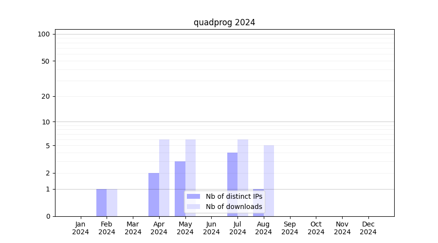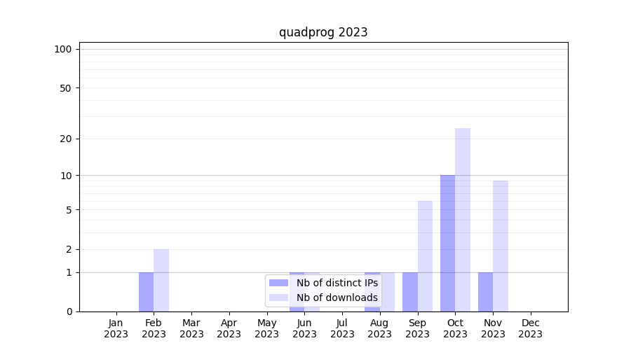 Number of downloads for annotation package quadprog, year by year, from 2025 back to 2014 (years with no downloads are omitted):