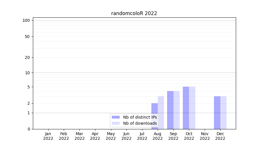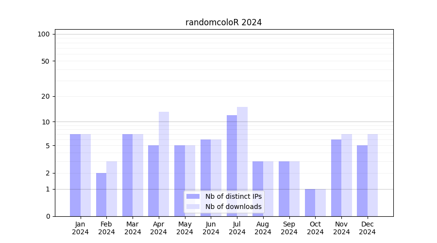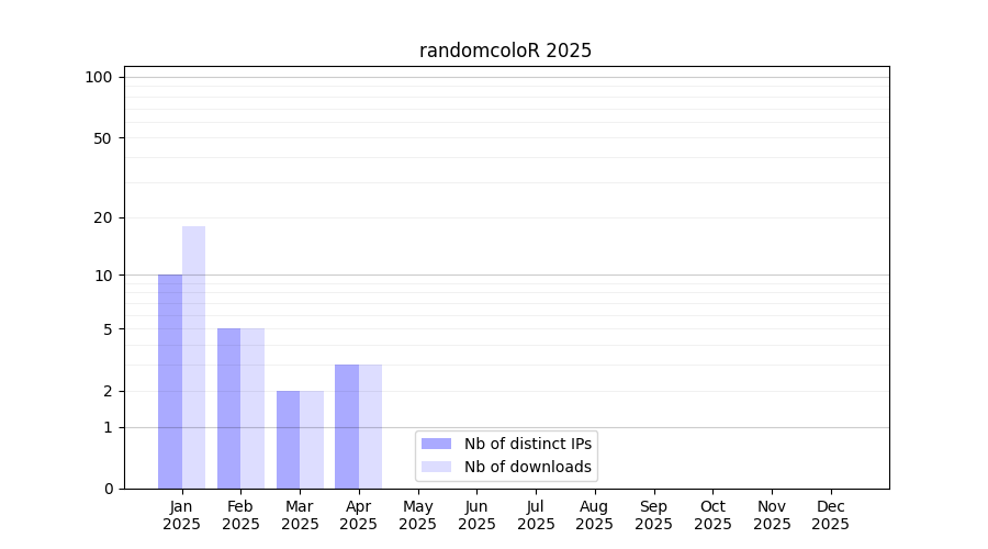 Number of downloads for annotation package randomcoloR, year by year, from 2025 back to 2014 (years with no downloads are omitted):