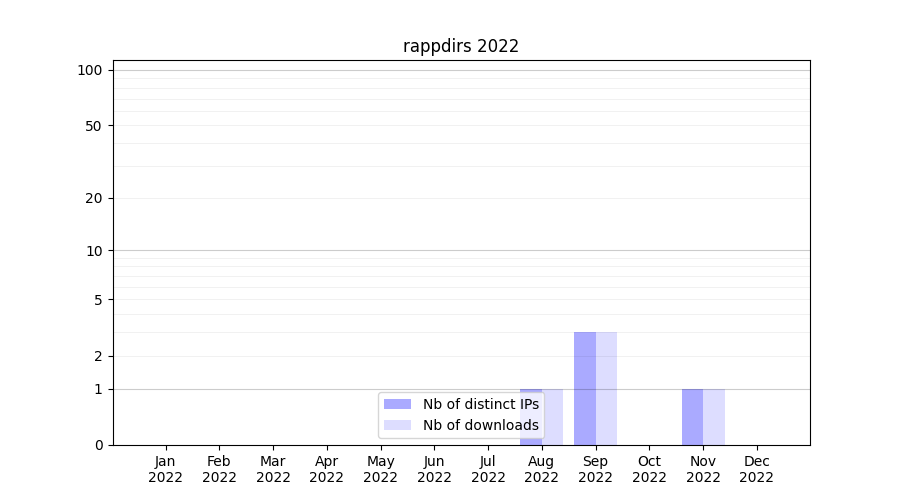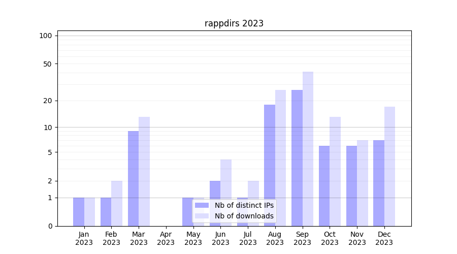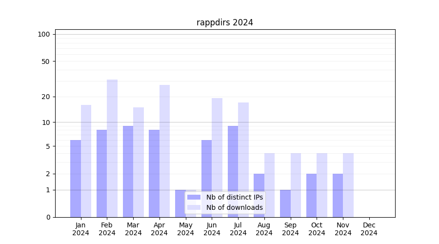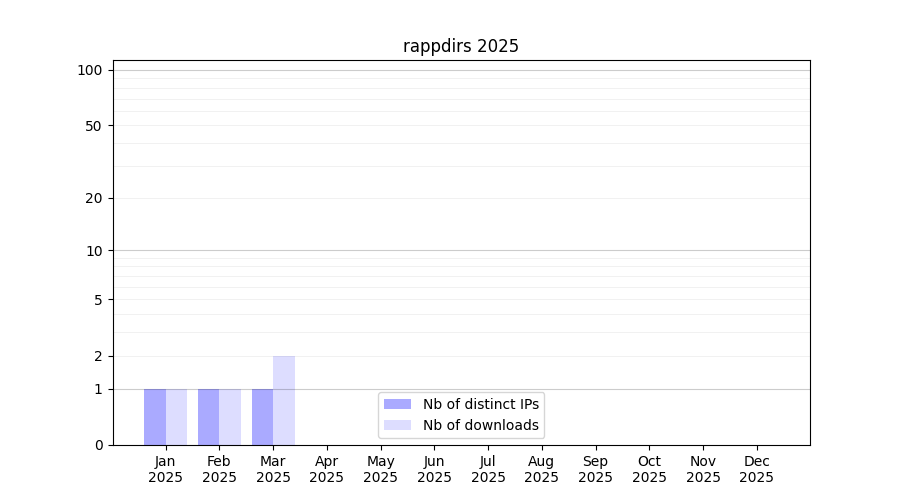 Number of downloads for annotation package rappdirs, year by year, from 2025 back to 2014 (years with no downloads are omitted):