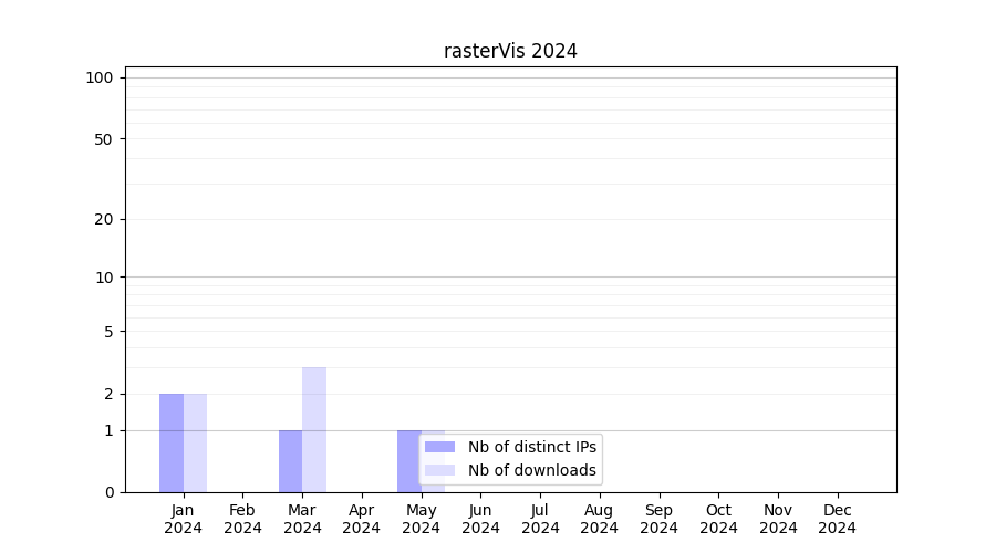 Number of downloads for annotation package rasterVis, year by year, from 2025 back to 2014 (years with no downloads are omitted):