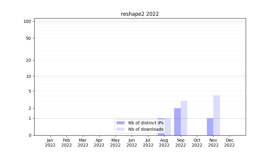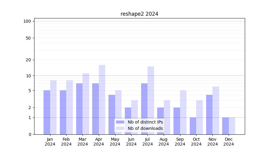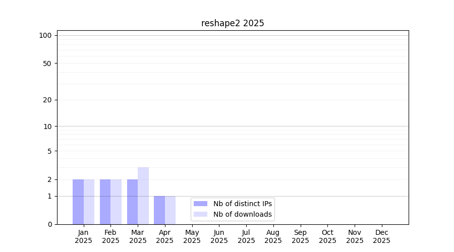 Number of downloads for annotation package reshape2, year by year, from 2025 back to 2014 (years with no downloads are omitted):