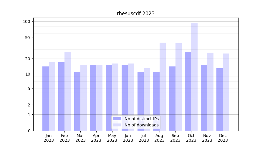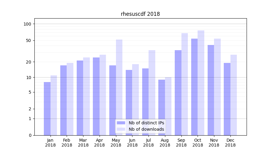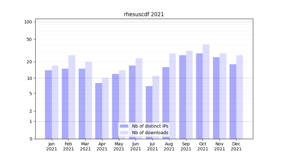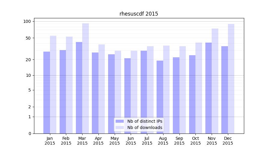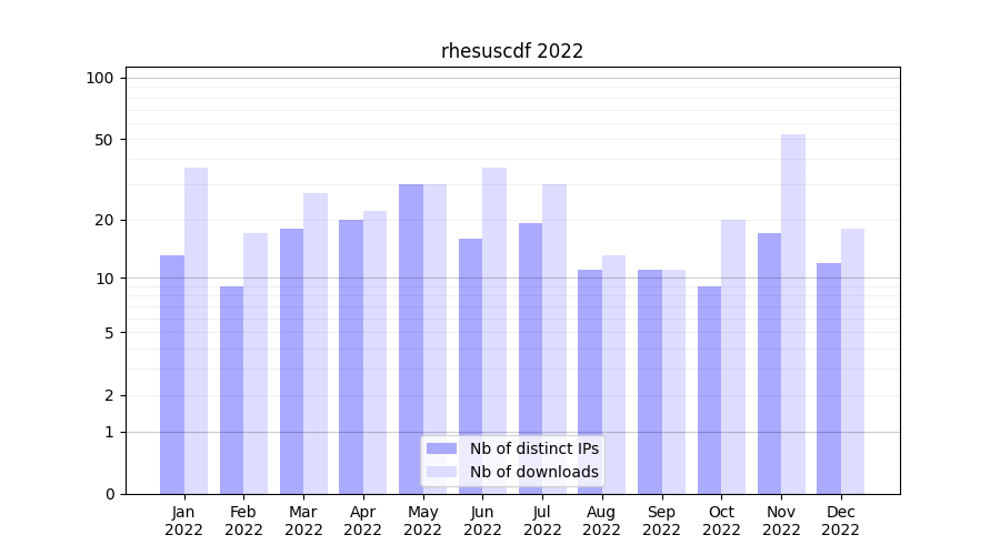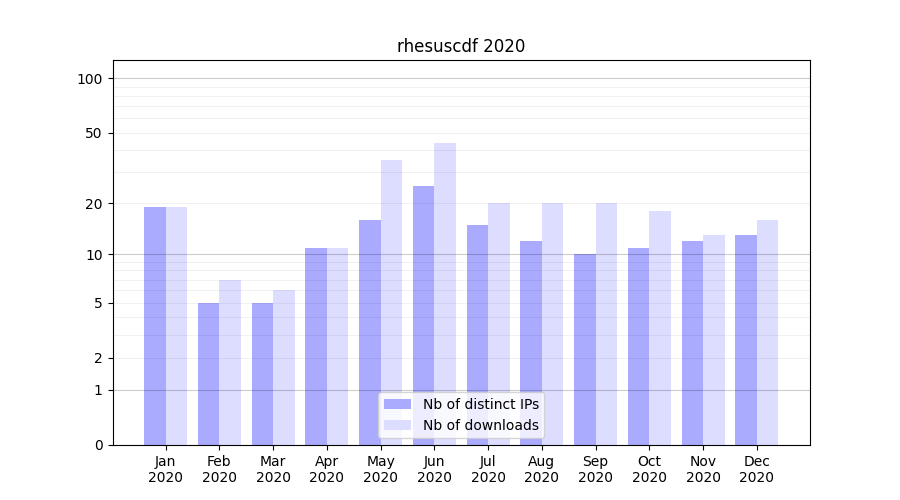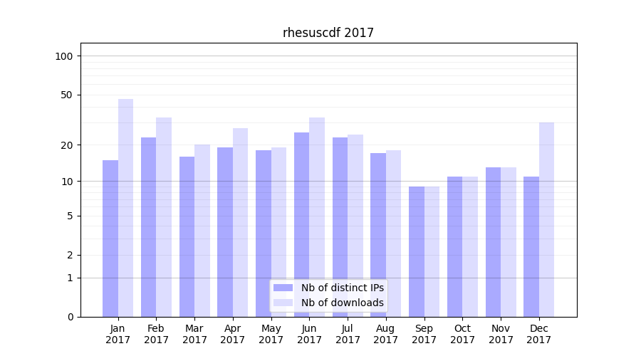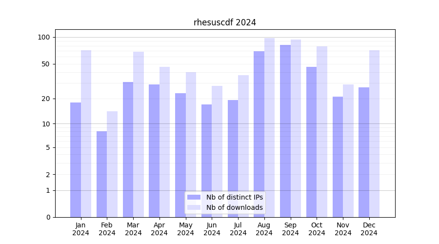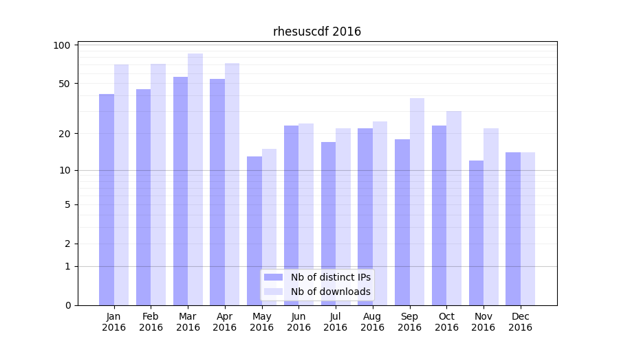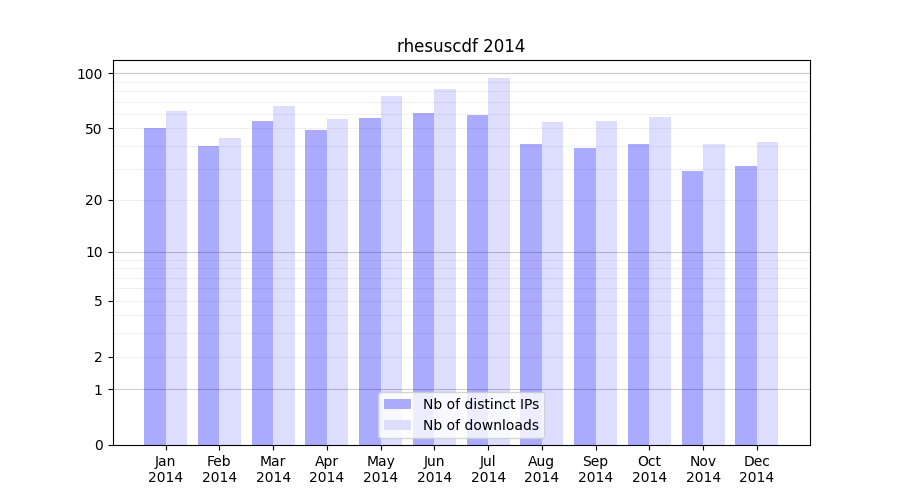 Number of downloads for annotation package rhesuscdf, year by year, from 2025 back to 2014 (years with no downloads are omitted):