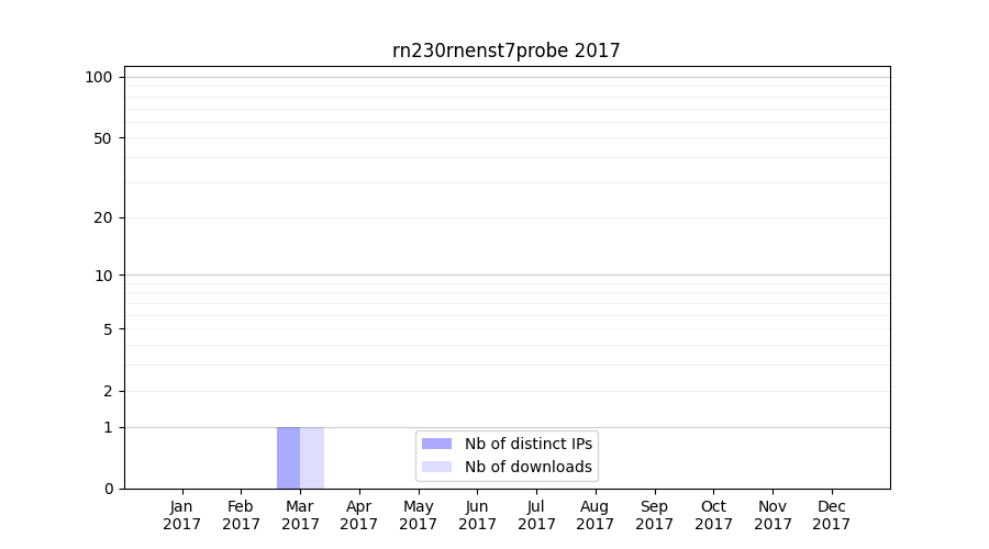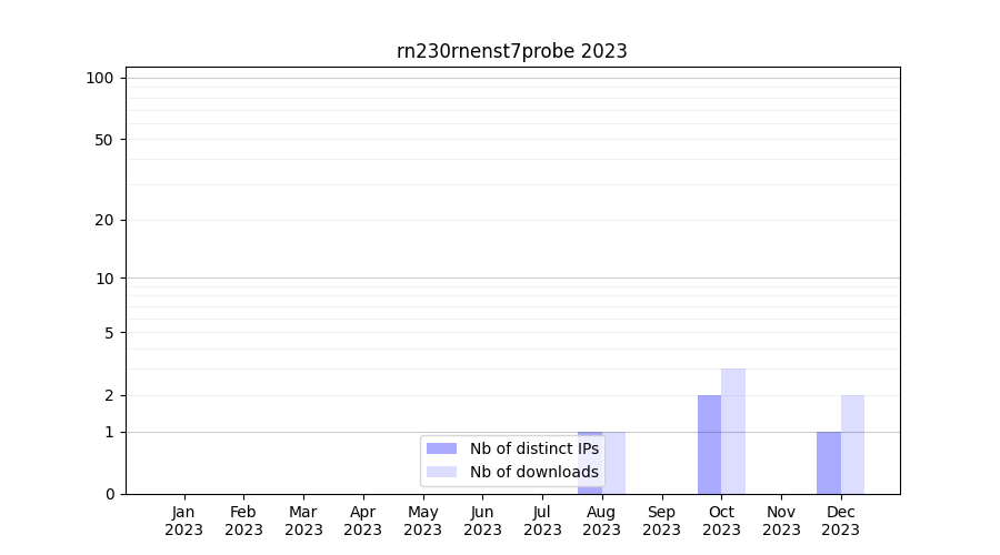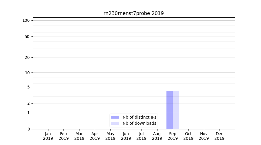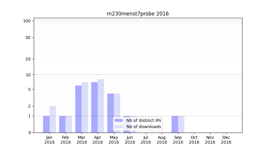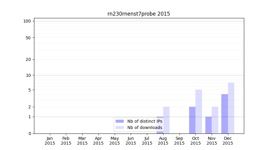 Number of downloads for annotation package rn230rnenst7probe, year by year, from 2025 back to 2014 (years with no downloads are omitted):