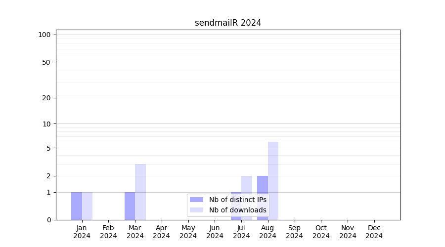 Number of downloads for annotation package sendmailR, year by year, from 2025 back to 2014 (years with no downloads are omitted):