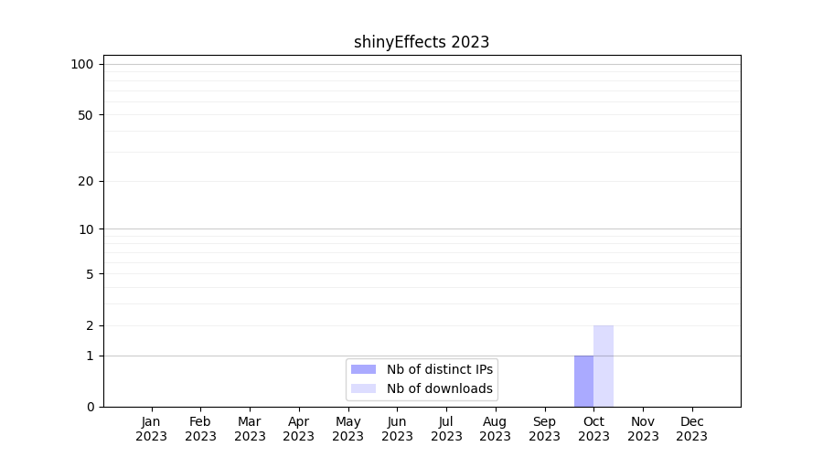 Number of downloads for annotation package shinyEffects, year by year, from 2025 back to 2014 (years with no downloads are omitted):