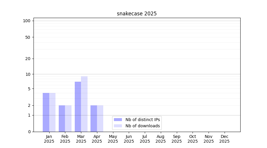 Number of downloads for annotation package snakecase, year by year, from 2025 back to 2014 (years with no downloads are omitted):
