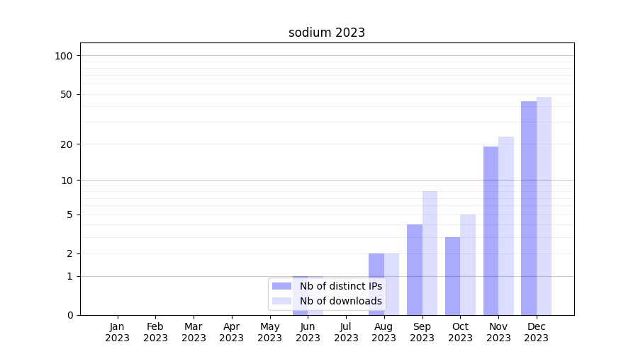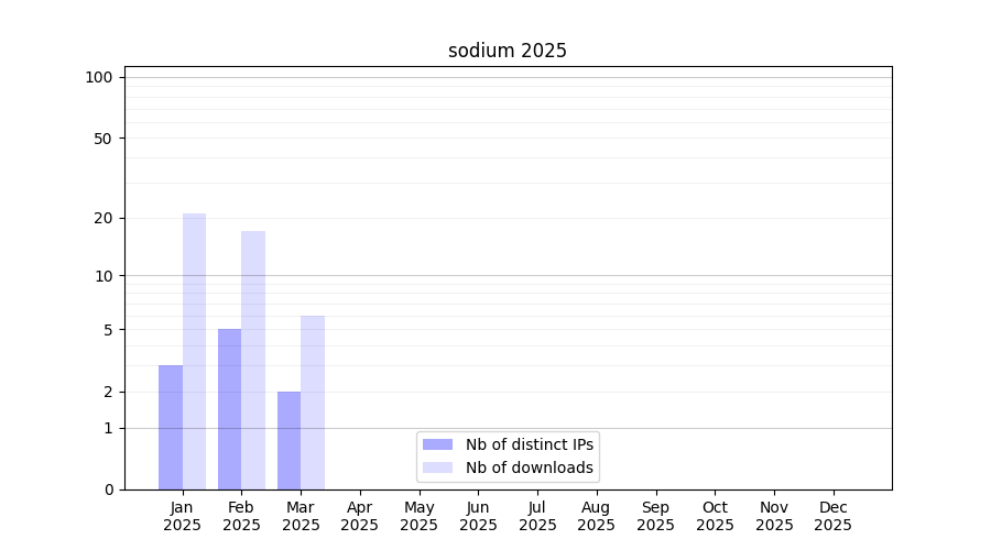 Number of downloads for annotation package sodium, year by year, from 2025 back to 2014 (years with no downloads are omitted):