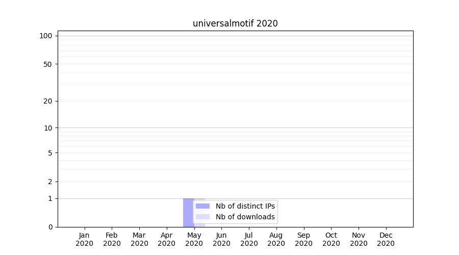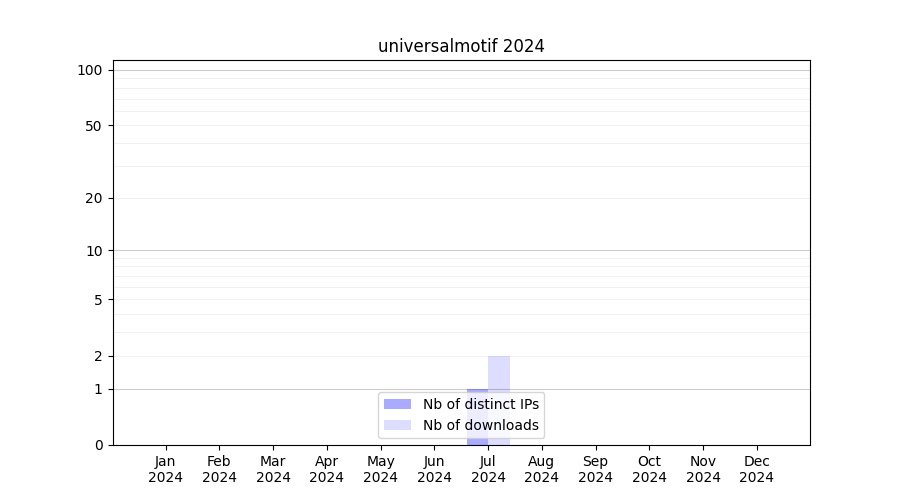 Number of downloads for annotation package universalmotif, year by year, from 2025 back to 2014 (years with no downloads are omitted):