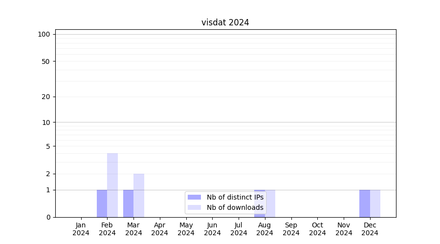 Number of downloads for annotation package visdat, year by year, from 2025 back to 2014 (years with no downloads are omitted):