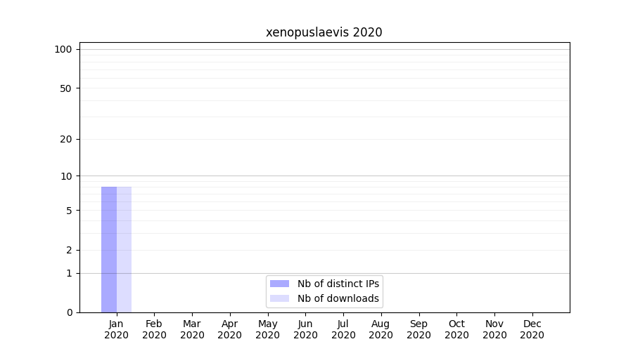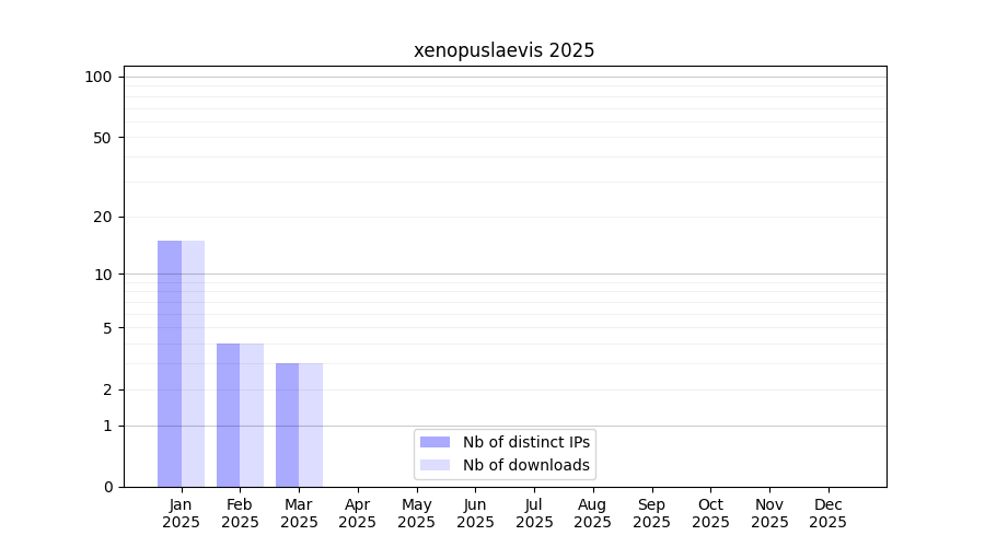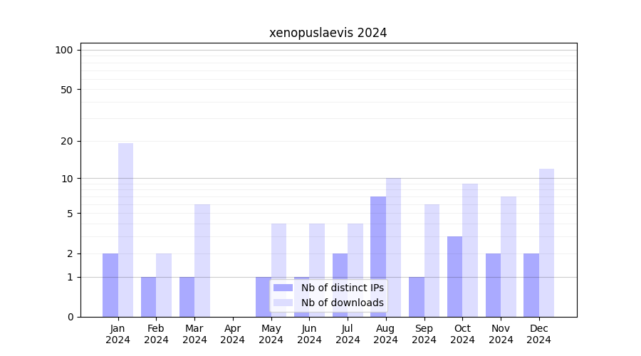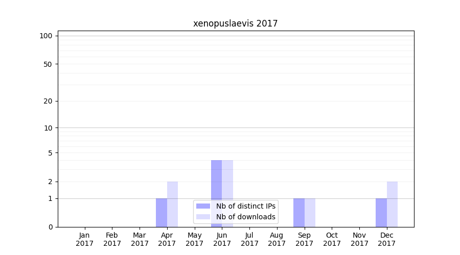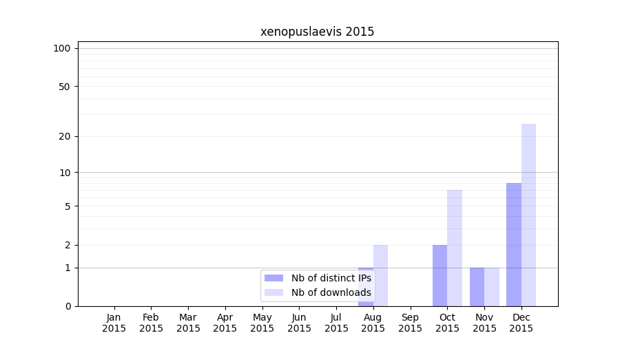 Number of downloads for annotation package xenopuslaevis, year by year, from 2025 back to 2014 (years with no downloads are omitted):