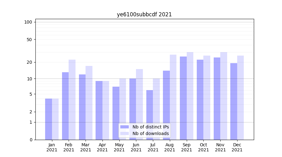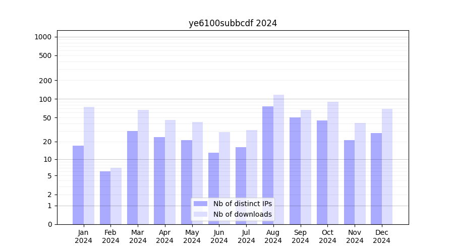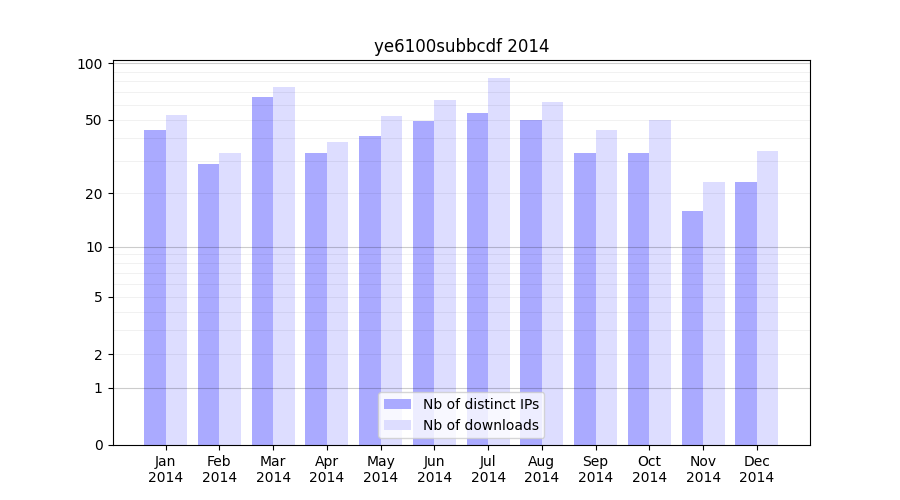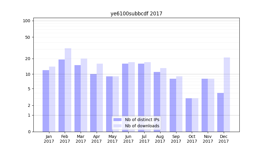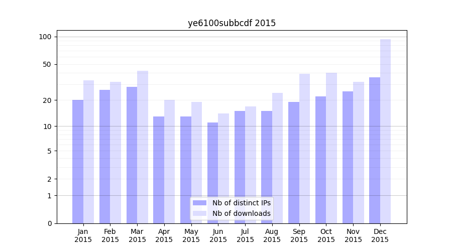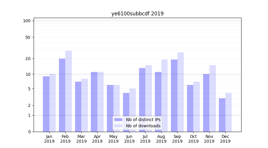 Number of downloads for annotation package ye6100subbcdf, year by year, from 2025 back to 2014 (years with no downloads are omitted):