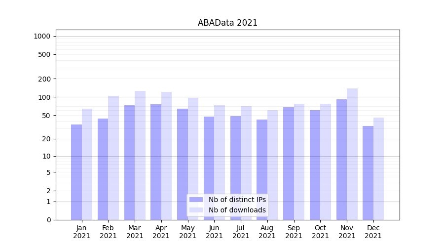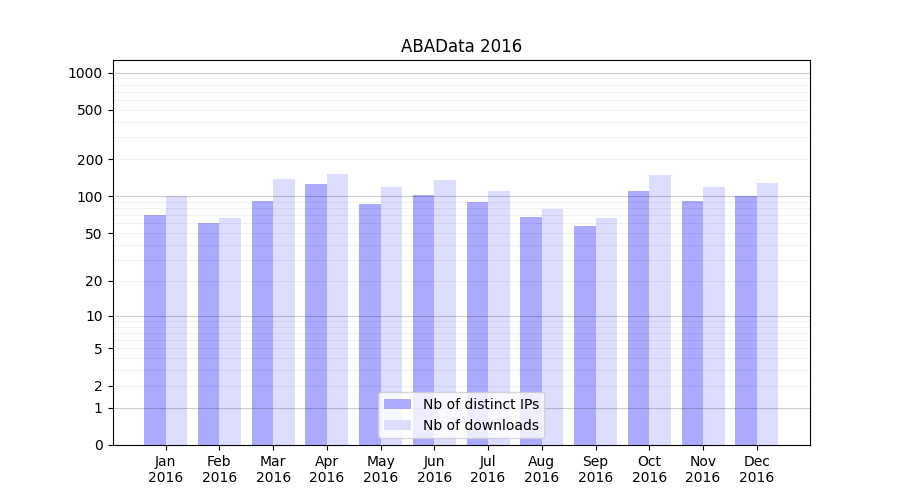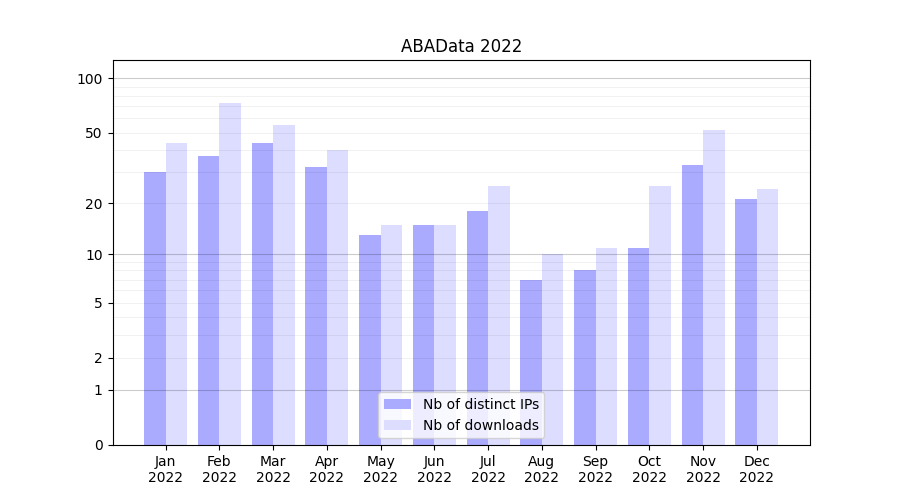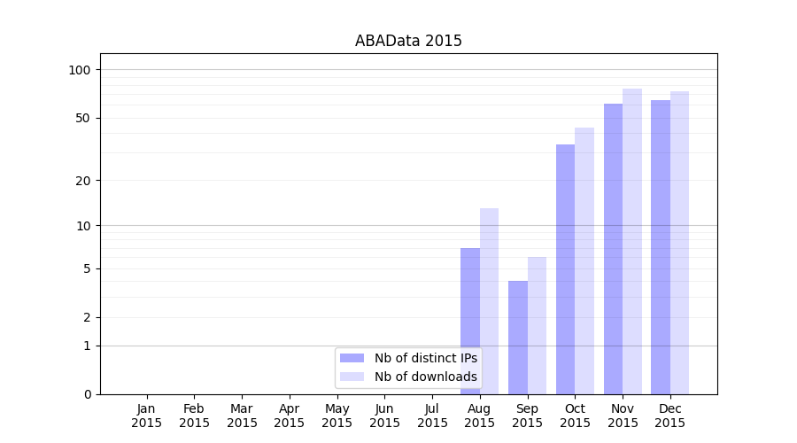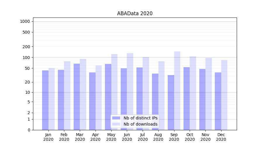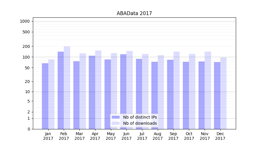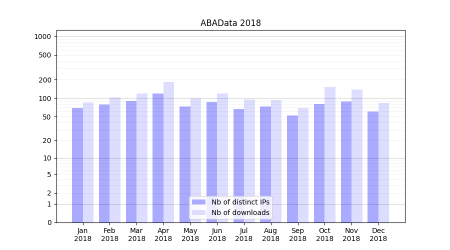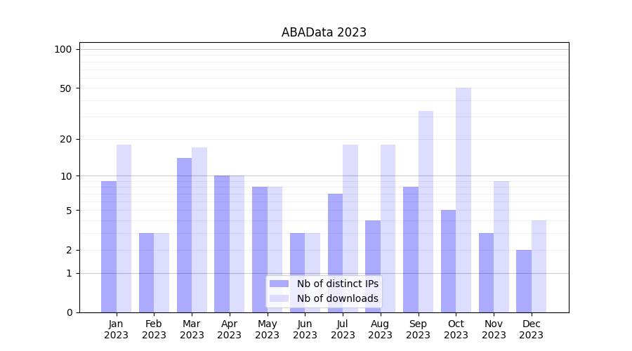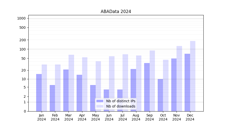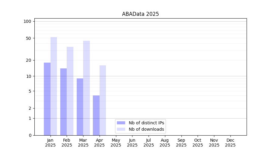 Number of downloads for experiment package ABAData, year by year, from 2025 back to 2014 (years with no downloads are omitted):
