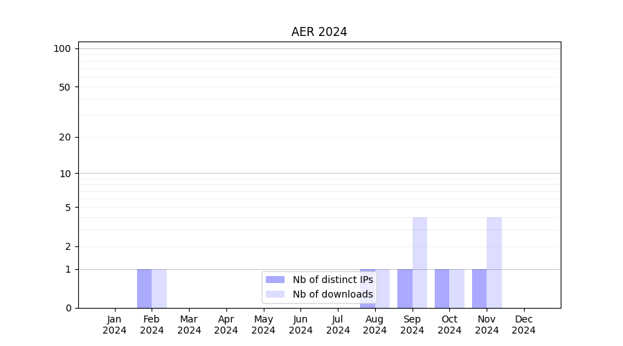Number of downloads for experiment package AER, year by year, from 2025 back to 2014 (years with no downloads are omitted):