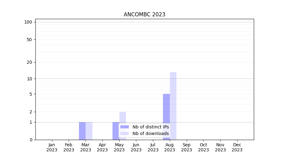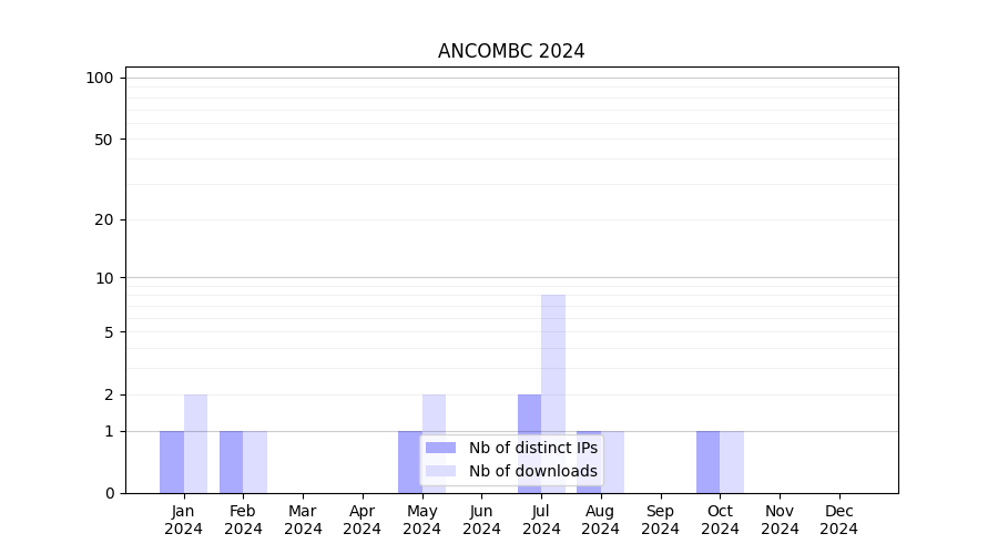 Number of downloads for experiment package ANCOMBC, year by year, from 2025 back to 2014 (years with no downloads are omitted):