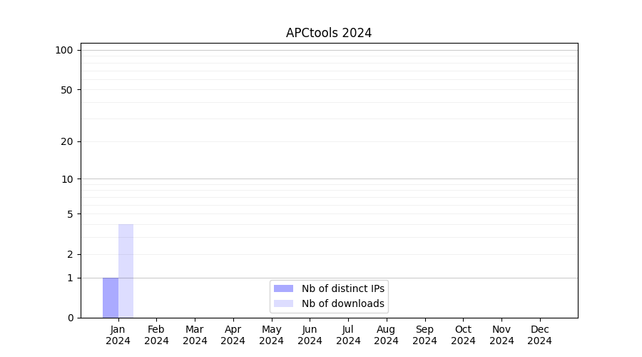 Number of downloads for experiment package APCtools, year by year, from 2025 back to 2014 (years with no downloads are omitted):
