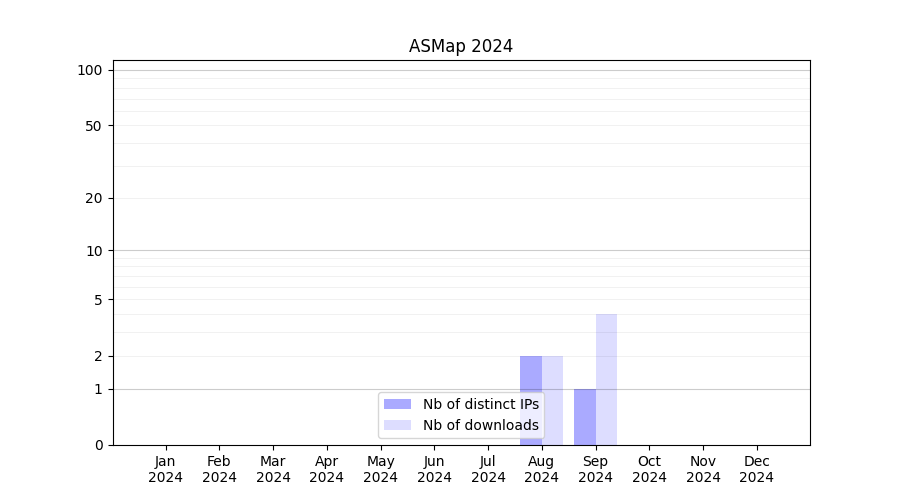 Number of downloads for experiment package ASMap, year by year, from 2025 back to 2014 (years with no downloads are omitted):