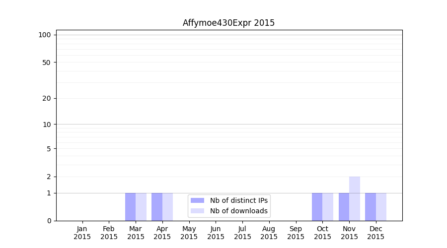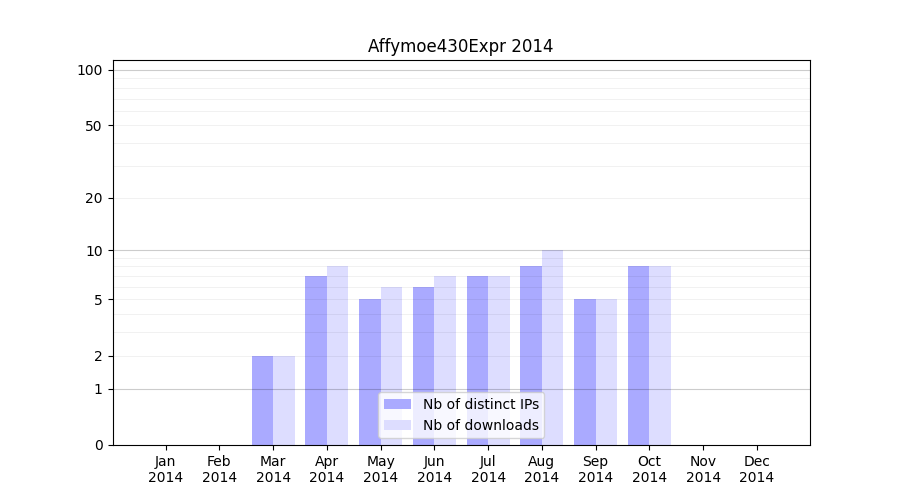 Number of downloads for experiment package Affymoe430Expr, year by year, from 2025 back to 2014 (years with no downloads are omitted):