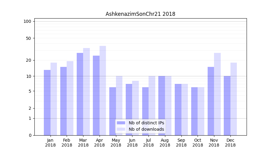 Number of downloads for experiment package AshkenazimSonChr21, year by year, from 2025 back to 2014 (years with no downloads are omitted):