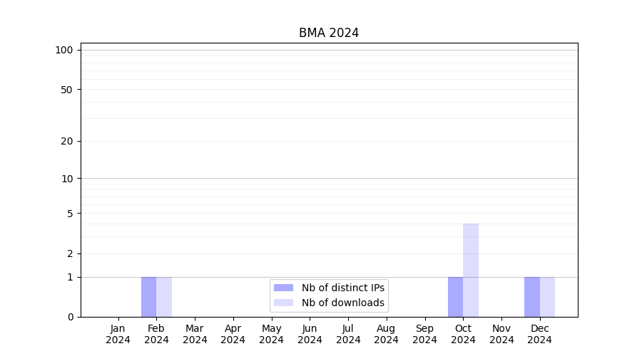 Number of downloads for experiment package BMA, year by year, from 2025 back to 2014 (years with no downloads are omitted):