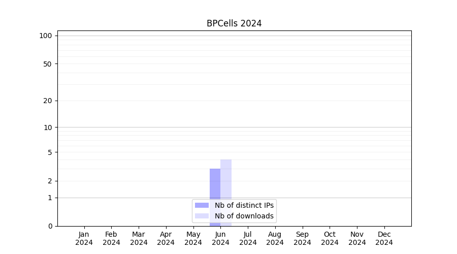 Number of downloads for experiment package BPCells, year by year, from 2025 back to 2014 (years with no downloads are omitted):