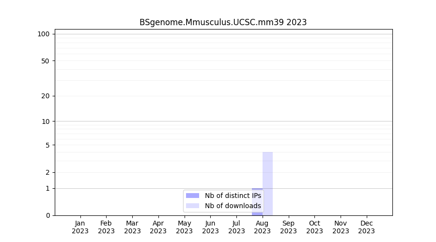 Number of downloads for experiment package BSgenome.Mmusculus.UCSC.mm39, year by year, from 2025 back to 2014 (years with no downloads are omitted):