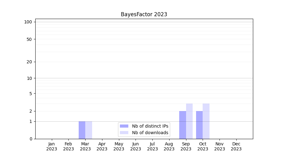 Number of downloads for experiment package BayesFactor, year by year, from 2025 back to 2014 (years with no downloads are omitted):