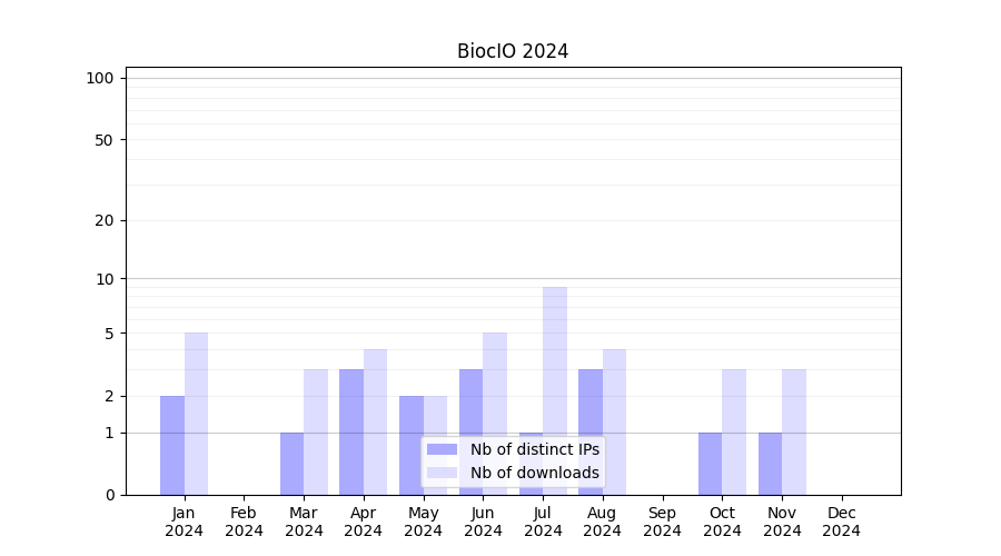 Number of downloads for experiment package BiocIO, year by year, from 2025 back to 2014 (years with no downloads are omitted):