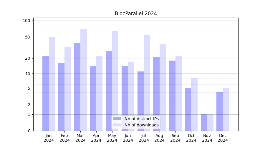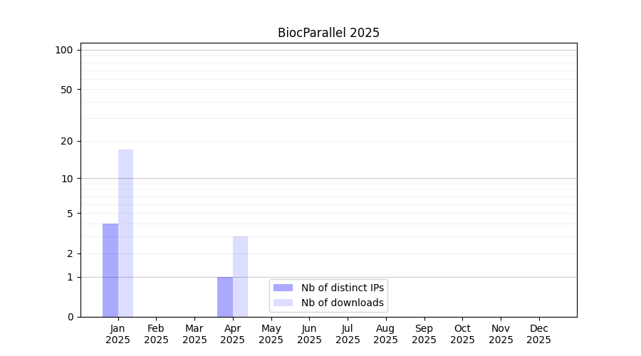 Number of downloads for experiment package BiocParallel, year by year, from 2025 back to 2014 (years with no downloads are omitted):
