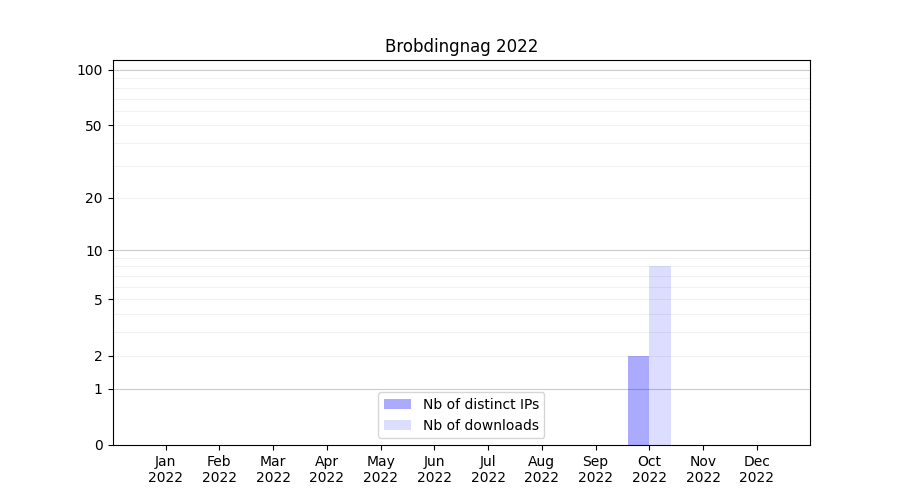 Number of downloads for experiment package Brobdingnag, year by year, from 2025 back to 2014 (years with no downloads are omitted):