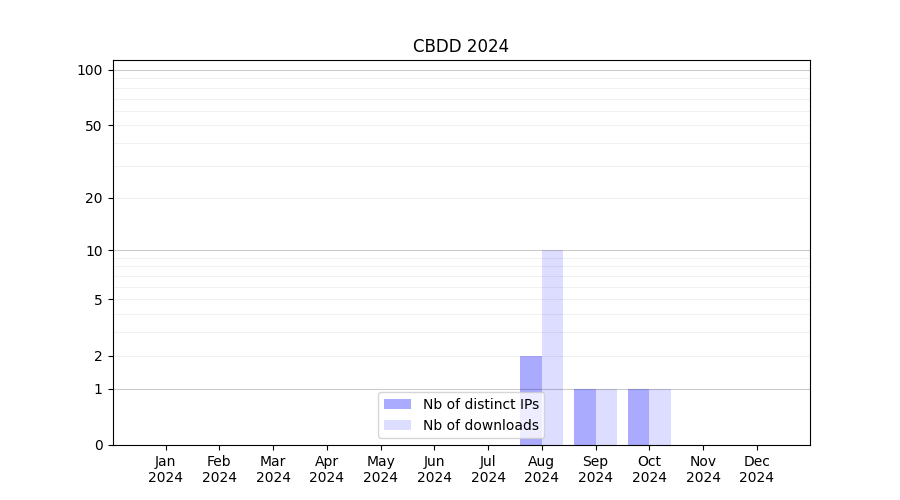 Number of downloads for experiment package CBDD, year by year, from 2025 back to 2014 (years with no downloads are omitted):