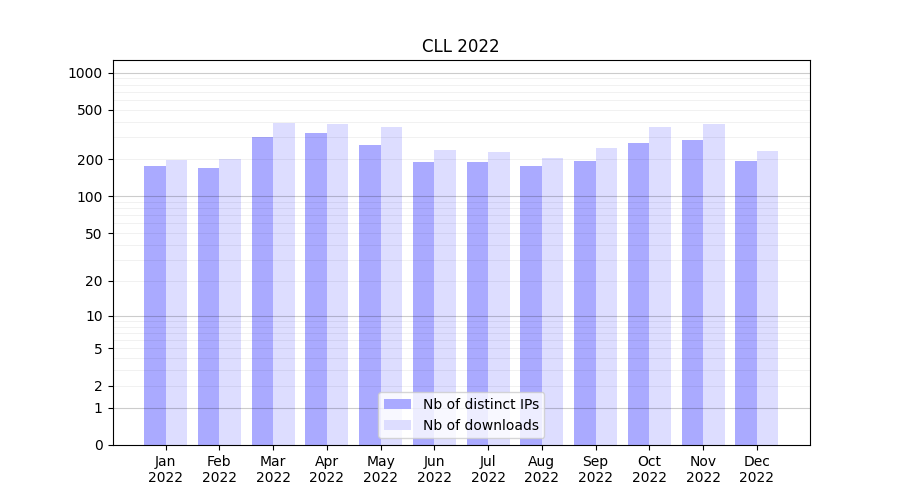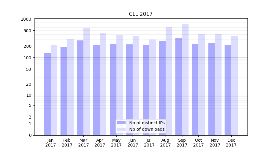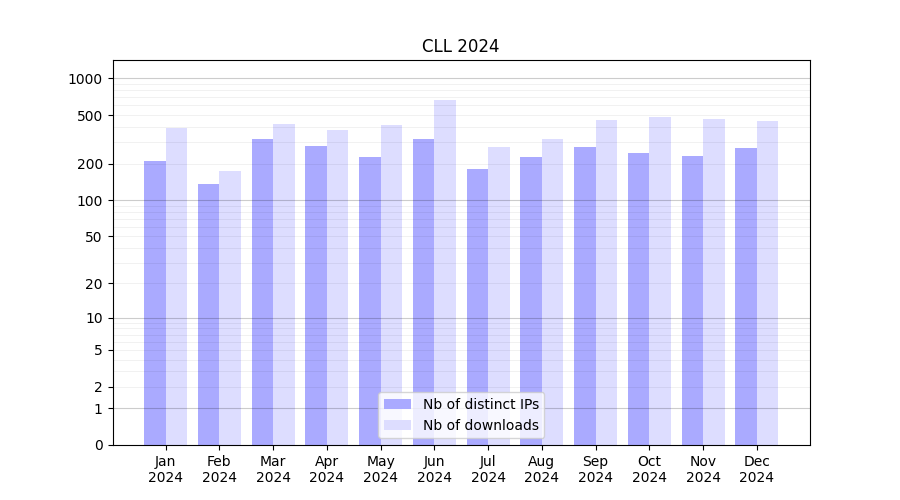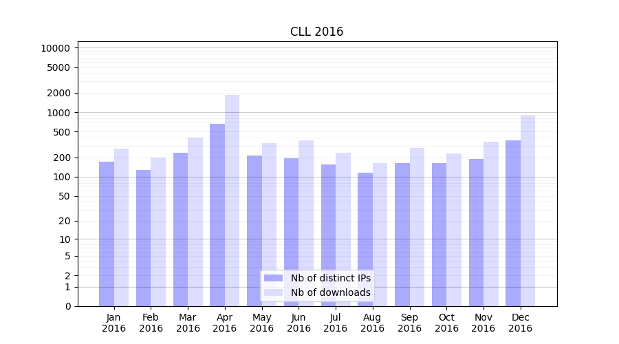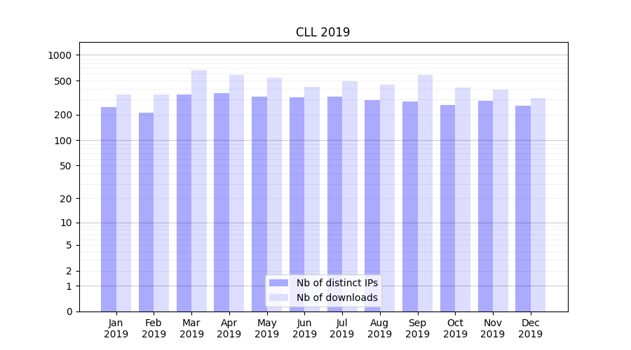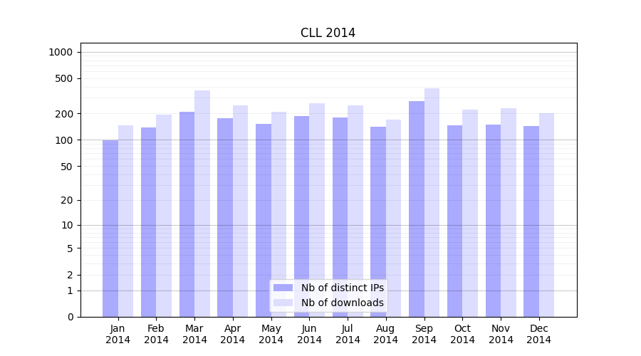 Number of downloads for experiment package CLL, year by year, from 2025 back to 2014 (years with no downloads are omitted):
