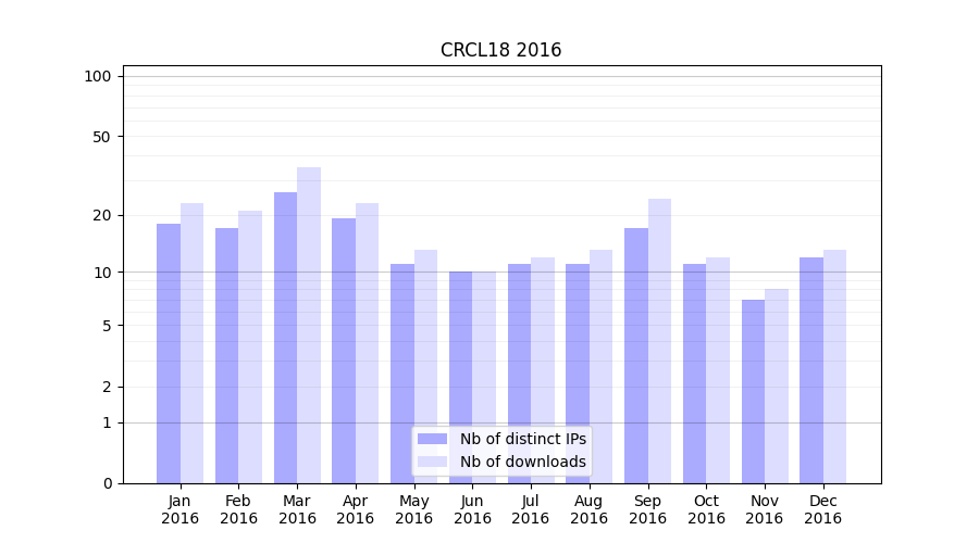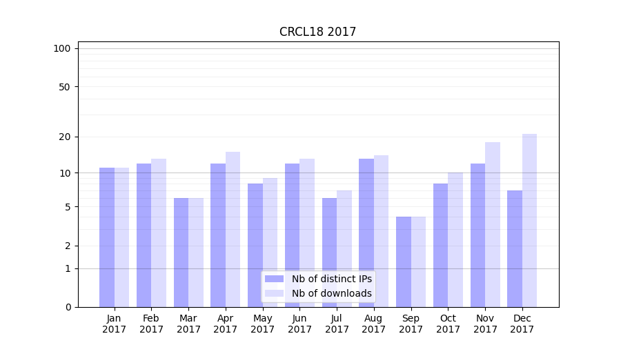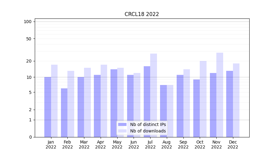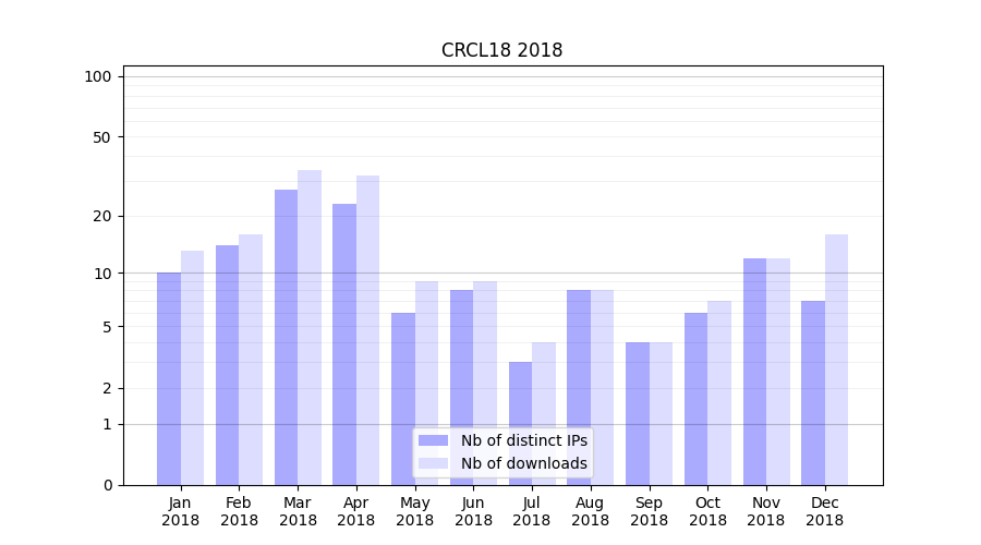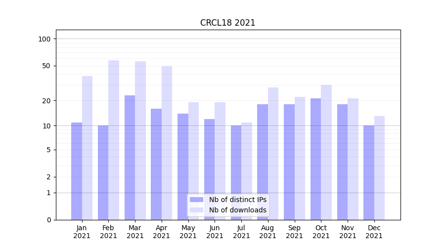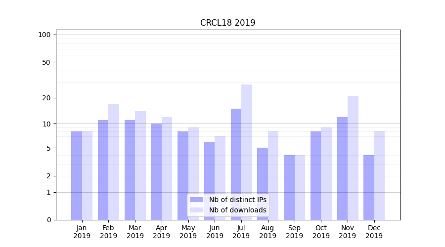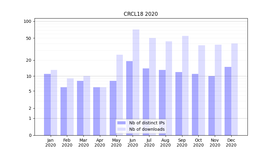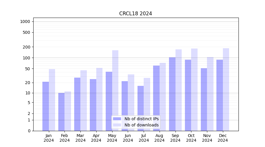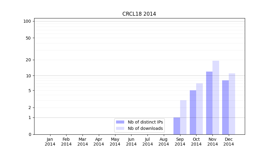 Number of downloads for experiment package CRCL18, year by year, from 2025 back to 2014 (years with no downloads are omitted):