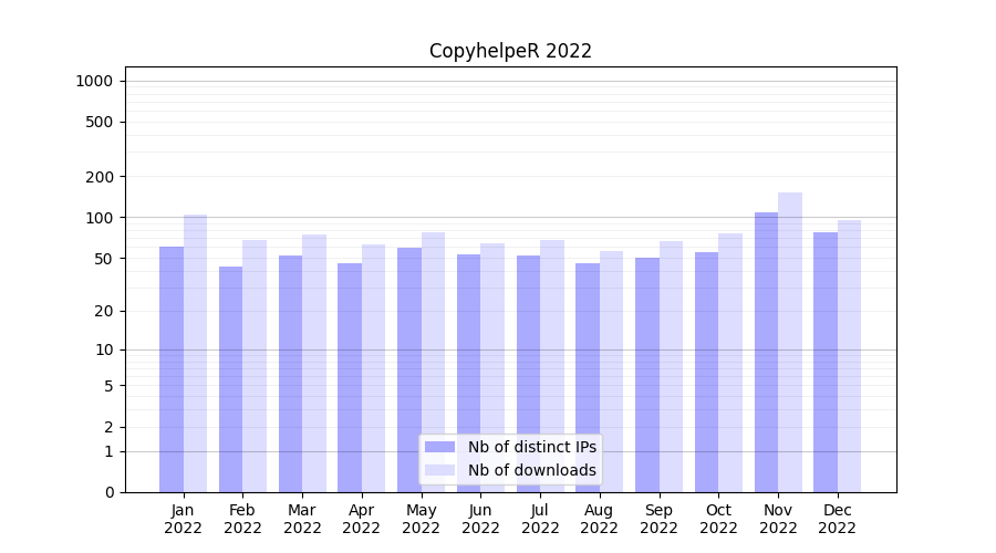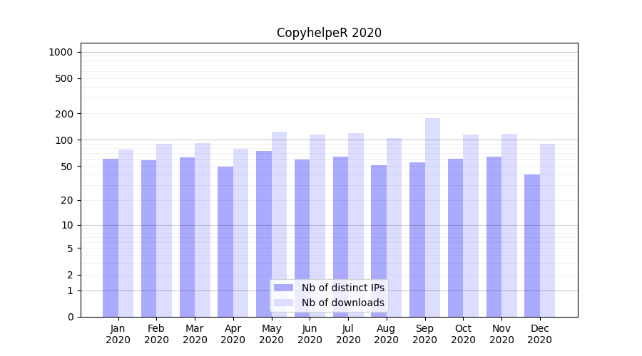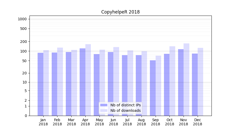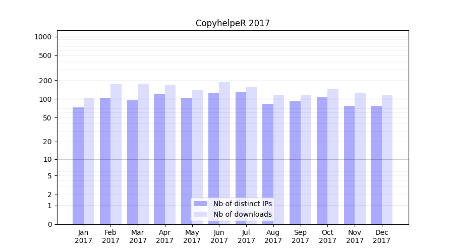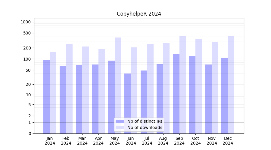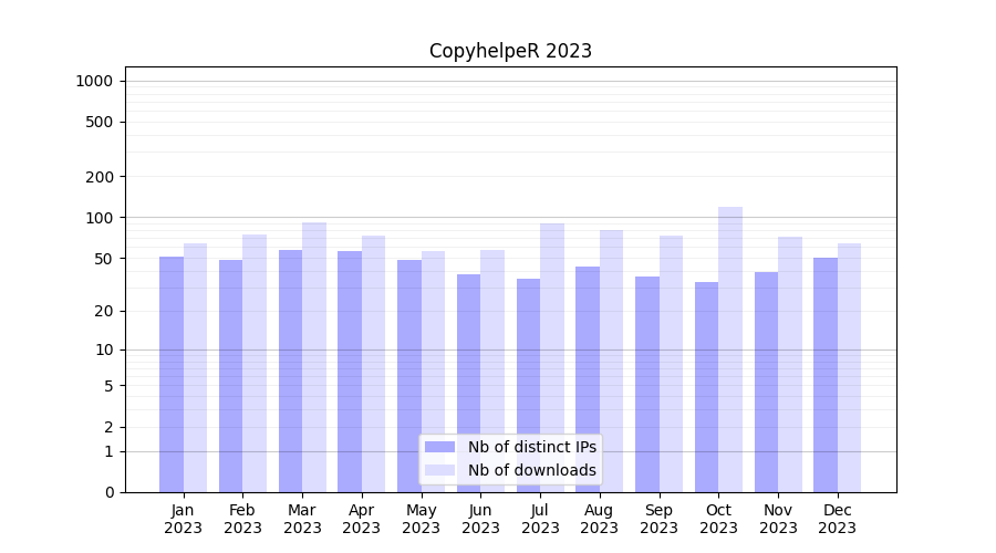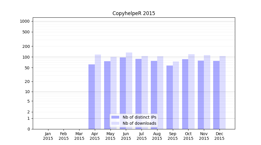Number of downloads for experiment package CopyhelpeR, year by year, from 2025 back to 2014 (years with no downloads are omitted):