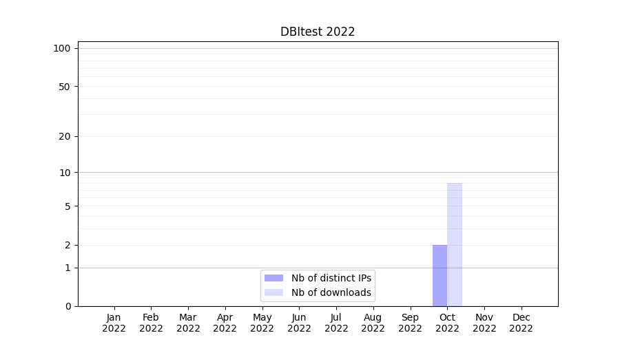 Number of downloads for experiment package DBItest, year by year, from 2025 back to 2014 (years with no downloads are omitted):