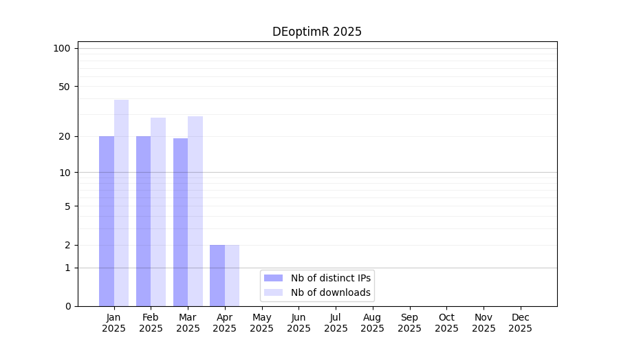 Number of downloads for experiment package DEoptimR, year by year, from 2025 back to 2014 (years with no downloads are omitted):